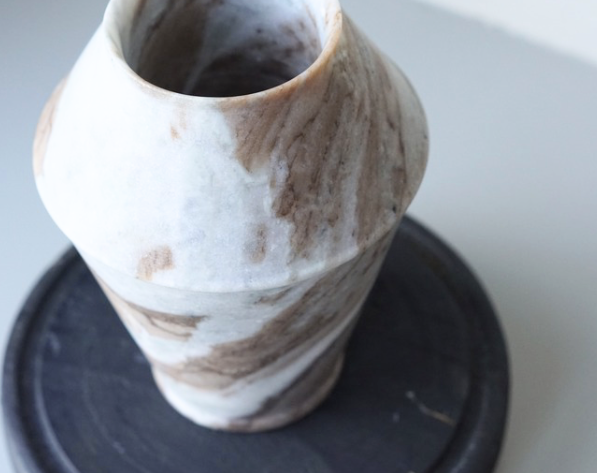 Marmer behoort tot de favoriete materialen van ontwerpster Kelly Wearstler. De °2 vaas uit de Dune-collectie, uitgevoerd in bruin marmer, belichaamt volgens haar de weerkaatsende vibraties van verstuivend zand. De fijne details en het aardse kleurenpalet geven de vaas een natuurlijke elegantie die doet denken aan de eindeloze beweging van de duinen.